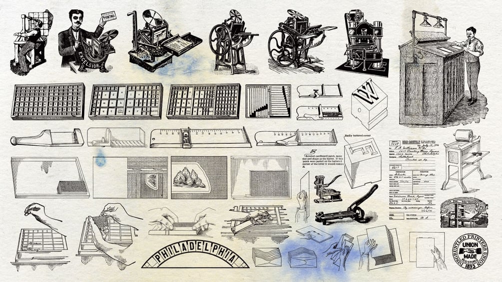 A collection of 41 Print Shop illustrations from the ancient times of movable type.